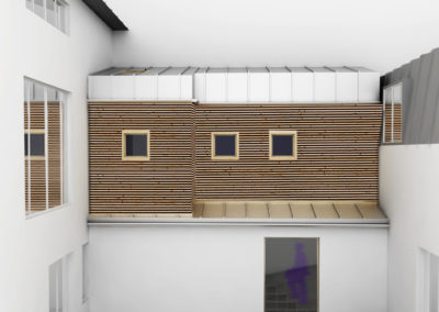 Niché entre 2 immeubles d’une copropriété parisienne, un écrin de bois et de zinc de 13 m² orienté sud-ouest constitue une surélévation, connexion entre l’appartement de Madame situé à R+2 et celui de Monsieur, à R+1.